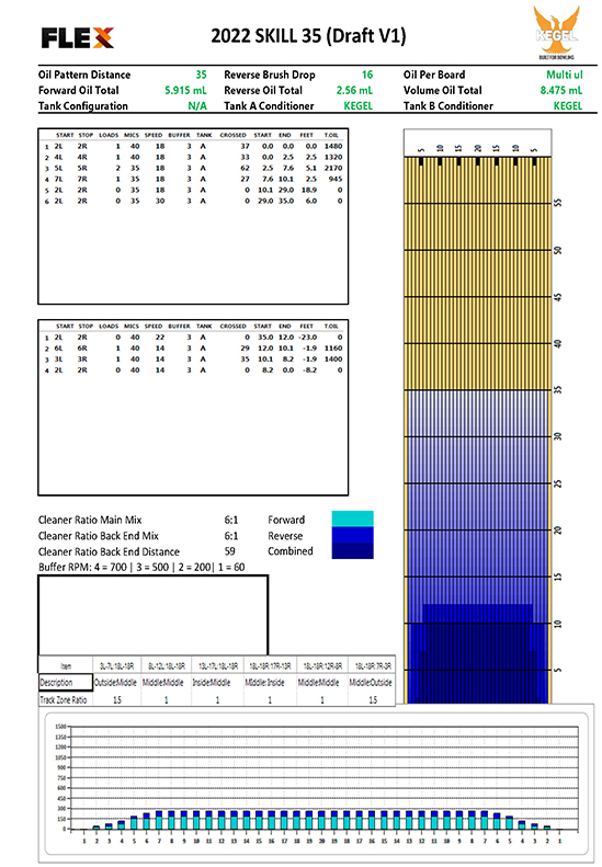 SKILL 35 on all even-numbered lanes. 35 feet in length with 8 to 8.5 mL of oil.